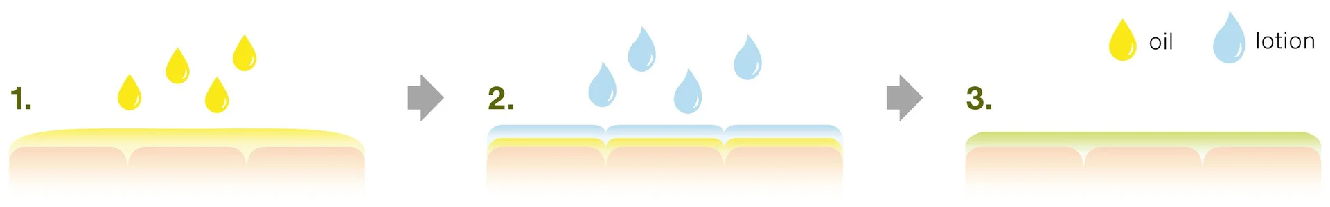 The oil primes the skin with rich moisture (1), and when layered over by the lotion (2) they transform into a smooth long-lasting moisture veil (3).